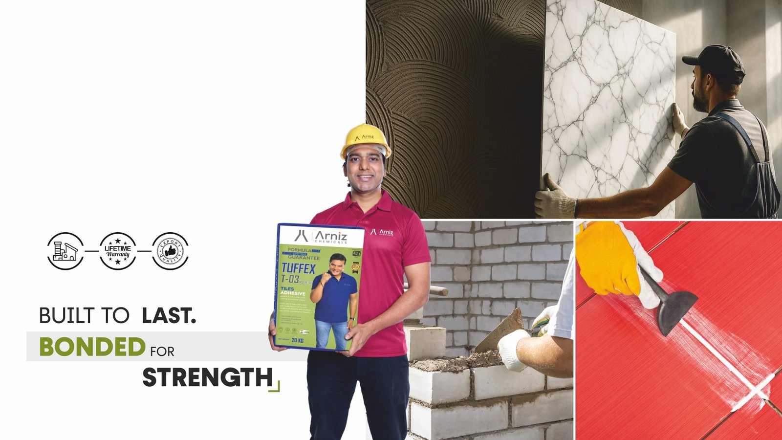 Arniz Chemicals delivers reliable, high-performance construction chemical solutions tailored to today’s on-site challenges—ensuring strength, consistency, and long-term durability. Our range includes Tile Adhesive, Tile Grout, Epoxy Grout, Block Jointing Mortar, Tile Cleaner, and Tap Cleaner,PU Adhesive—trusted by professionals across residential, commercial, and infrastructure projects. With a growing presence in Tier-1 and Tier-2 cities, Arniz is emerging as a trusted name for quality, value, and performance.